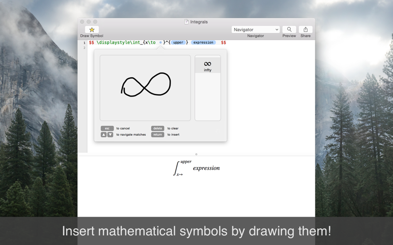 Just getting started with LaTeX syntax? Dont know the code for the asymptotically equal symbol? Use your MacBooks trackpad or Magic Trackpad to draw it! Archimedes will recognize the symbol and insert the corresponding code for you.