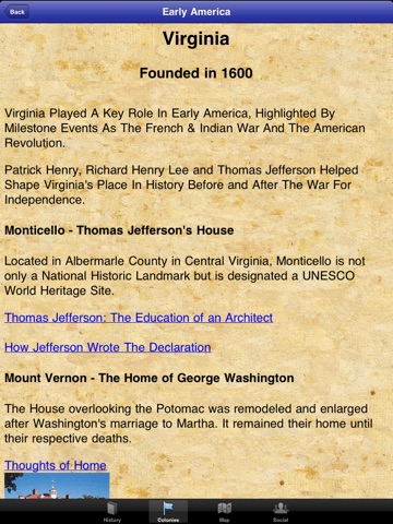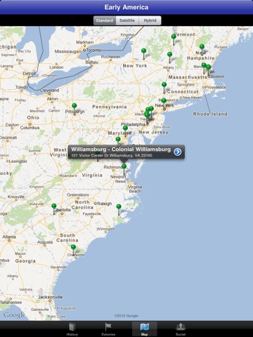 Discover early Americas historic sites as you tour the 13 original colonies. Each colony offers guideposts to visit the historic places that are part of the American heritage. Prepare for your trip with locations, visiting hours, directions -- everything you need for your visit to Americas historic sites. Plus, easy GPS routing shows you how to find your way to each site.