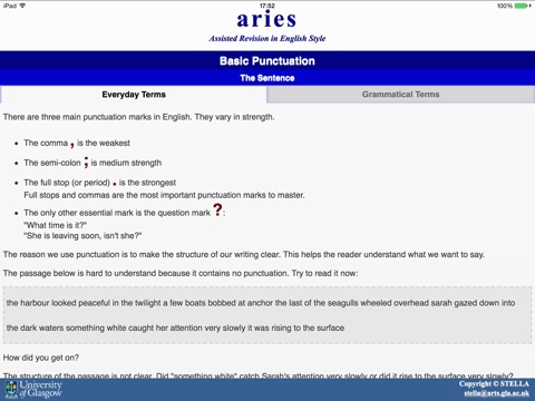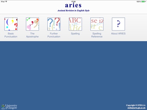 ARIES (Assisted Revision In English Style) is designed to assist you in your academic writing, through strengthening your grammar and developing your academic style. It consists of a series of units, which build up from improving your sentence structure and punctuation, to structuring your essays, producing effective and clear arguments, and properly referencing other material in your own work. Each unit is composed of a mixture of explanation and interactive exercises, allowing you to test, as well as improve, your knowledge.