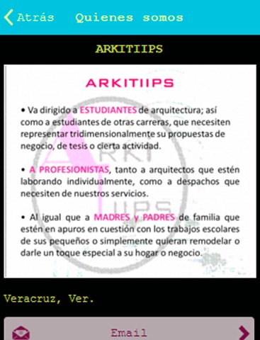 El propósito de esta Apps es que nos conozcas y ofrecer nuestros servicios de diseño, modelado/renders, planificación, maquetas y consultoría arquitectónica, de tal manera que nos puedan contactar; así mismo dar a conocer diversos tips para estudiantes de arquitectura, desde consejos a la hora de maquetear como recomendaciones de libros para la tesis. Compartiendo también artículos e imágenes innovadoras de la arquitectura de hoy en día.