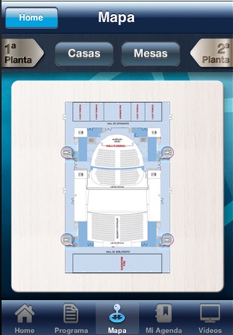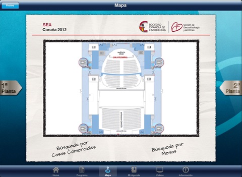 - Mapa, donde se pueden ver las dos plantas del Palacio de Congreso. Pueden realizarse búsquedas sobre el mapa, tanto de las casas comerciales que participan como de las mesas, para saber en qué sala se van a desarrollar.