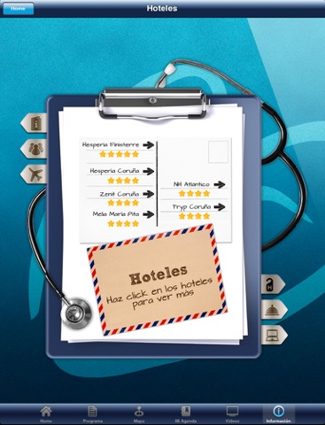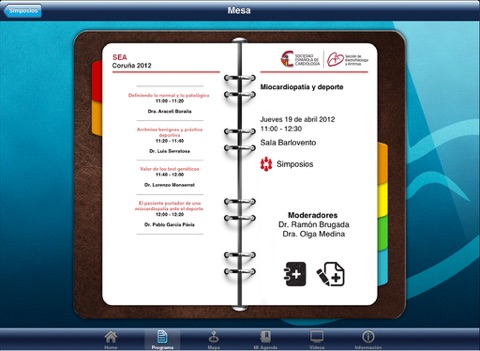 - Agenda. Lugar en el que se mostrarán las mesas guardadas desde la vista detalle y las notas escritas durante las ponencias.