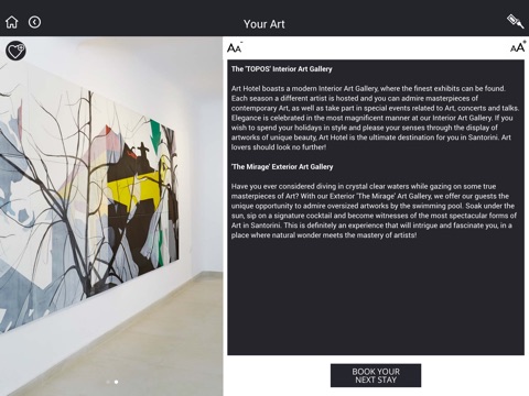 Art Hotel boasts a modern Interior Art Gallery, where the finest exhibits can be found. Each season a different artist is hosted and you can admire masterpieces of contemporary Art, as well as take part in special events related to Art, concerts and talks. Elegance is celebrated in the most magnificent manner at our Interior Art Gallery. If you wish to spend your holidays in style and please your senses through the display of artworks of unique beauty, Art Hotel is the ultimate destination for you in Santorini. Art lovers should look no further!
