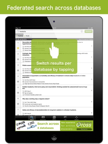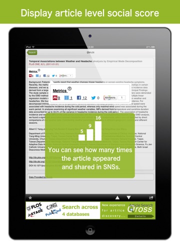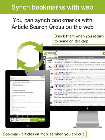 With “Article Search Qross”, you can search and find research papers on your iPhone/iPad, wherever you are. You may send results via email, save them into Mendeley, store them in Evernote, share them with friends via Facebook or Twitter. Also, you can share bookmarks between mobiles and PC by synchronizing app with web (https://qross.atlas.jp/) via your account.