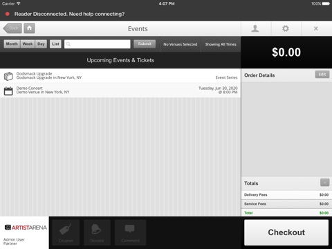 The Artist Arena Box Office app supports credit card swiping!