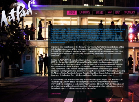 On May 17, ArtPadSF will launch with an exclusive preview show benefiting the 2012/13 SECA Art Award. Since 1967, SFMOMA’s SECA (Society for the Encouragement of Contemporary Art) has honored more than 70 Bay Area artists of exceptional promise with this biennial award. ArtPadSF co-founders, Chip Conley (also founder of Joie de Vivre Hotels) and Maria Jenson, have partnered with SECA to shine a light on this important award program that has drawn recognition to many Bay Area artists, including D-L Alvarez, Tauba Auerbach, Rosana Castrillo Díaz, Kota Ezawa, Colter Jacobsen, Chris Johanson, Ruth Laskey, Barry McGee, and Laurie Reid, among many others.