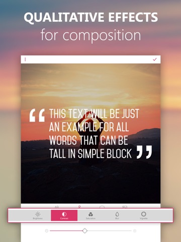 Easy to use app with an intuitive interface. Just select a typography and type a meaningful or funny text with a font of your choosing on preferred background. You can use your camera to make new pictures or use existing pics from the gallery or wallpapers included in the app.