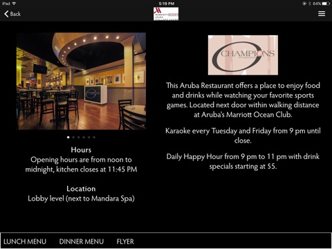 The Aruba Marriott Resort and Stellaris Casino mobile iPad app showcases our resort including highlights, amenities and special deals and offerings as well as the finest local attractions and dining hot spots within the island of Aruba.