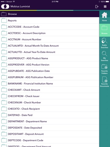 ASG-Mobius Luminist, an innovative app from ASG, permits users to access any content that the organization has archived in an ASG-ViewDirect repository, or that has been integrated via ASG-Total Content Integrator™ (TCI), directly from an iPad. With Luminist, users can browse through folders to find the documents they need, or use the handy search feature to locate documents that meet the organization’s specific criteria.