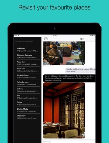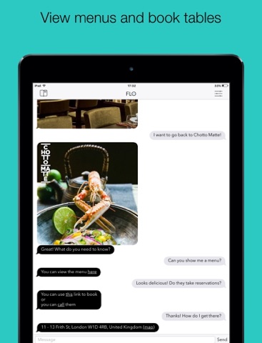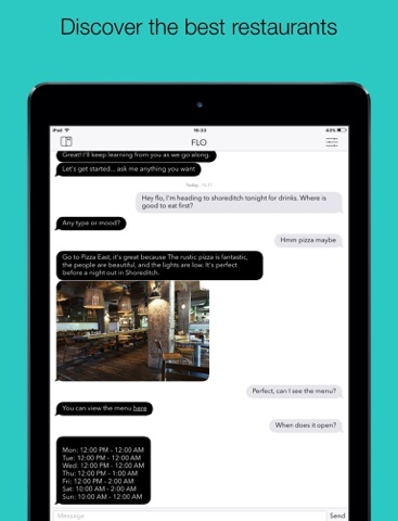 Flo helps you discover and book the greatest restaurants. Whatever the occasion, whether it’s a business lunch, a bottomless brunch, or a badass burger, Flo knows the best spots, and personalises the recommendations based on your preferences. Whatever information you need, from menus and opening hours to booking details and directions, just ask Flo.