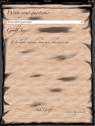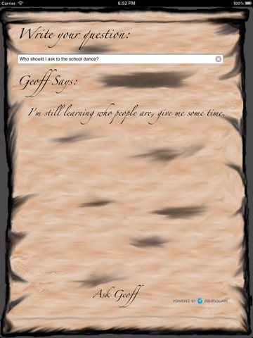 Ask Geoff is a way of asking a mystical wizard any question you can think. He analyzes each question and provides an appropriate answer to your question. He provides the best answer for yes or no questions, but he can also provide advice for every situation.