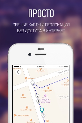 - Геолокация. Встроенная в приложение карта проведет Вас от точки к точке по всей длине маршрута.