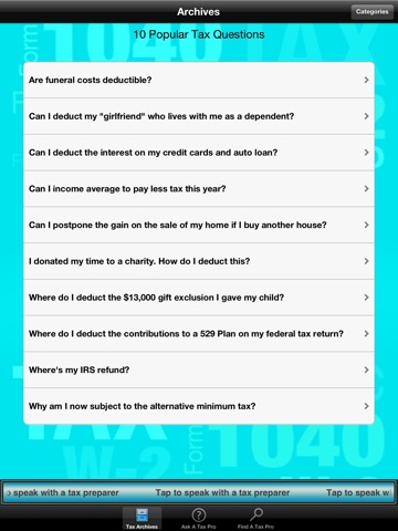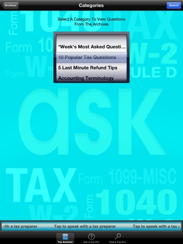1. Search the “TAX ARCHIVES” by category to find your tax answer instantly. New questions and answers are added daily without the need to update your App.