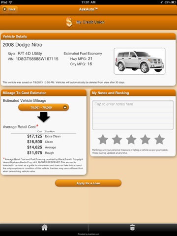 AskAuto rides along on your car shopping and buying experience by offering vehicle information and loan application assistance. As a participating credit union member, you can easily compare vehicles you find on the dealer lot, get information on loans, and submit a loan application – all from your mobile device. AskAuto pulls vehicle information like the average cost of a new or used car, EPA mileage estimates and more. Then, you can rank, compare and make notes on cars you’ve scanned. Plus, you can elect to receive messages from your credit union with loan offers and guidance and get them while you’re shopping on the dealer lot. It’s this simple: scan, compare and submit.