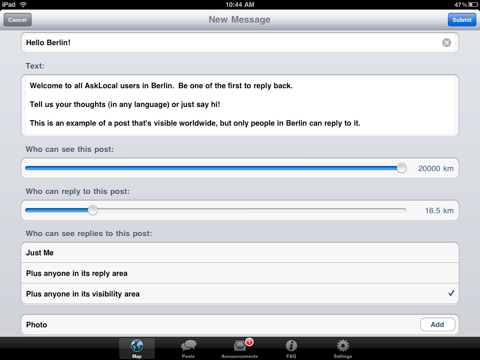 AskLocal is a revolutionary patent pending platform for communication by location - letting you post messages in your neighborhood or across the world while controlling who can see and reply to them based on their distance from your messages.