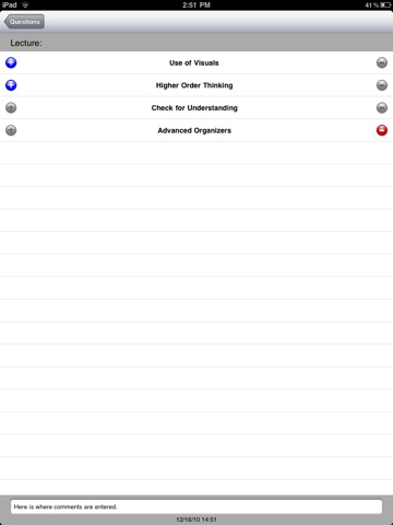 If you would like to create your own custom forms, view and print consolidated observation reports, and enter your subjects/persons to observe, you can use the web-based portion of this system by visiting www.facultytools.com. A single-user account may use the basic version of our system for free. You can set up your own form/questions, and enter a list of subjects to observe. Then, you can use the app to collect data, which is submitted to the reporting database. Reports can be set up to automatically sent to the observer, the subjects, or printed via the web.