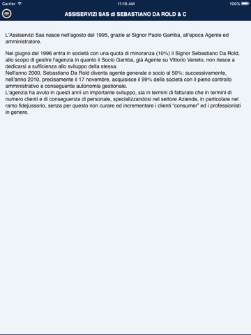 Nel giugno del 1996 entra in società con una quota di minoranza (10%) il Signor Sebastiano Da Rold, allo scopo di gestire lagenzia in quanto il Socio Gamba, già Agente su Vittorio Veneto, non riesce a dedicarsi a sufficienza allo sviluppo della stessa. Nellanno 2000, Sebastiano Da Rold diventa agente generale e socio al 50%; successivamente, nellanno 2010, precisamente il 17 novembre, acquisisce il 99% della società con il pieno controllo amministrativo e conseguente autonomia gestionale. Lagenzia ha avuto in questi anni un importante sviluppo, sia in termini di fatturato che in termini di numero clienti e di conseguenza di personale, specializzandosi nel settore Aziende, in particolare nel ramo fidejussorio, senza per questo non curare ed incrementare i clienti “consumer” ed i professionisti in genere. Proprio nell’ottica di fornire a tutti i propri Clienti un servizio sempre migliore, l’Assiservizi ha deciso di rendere loro disponibile uno strumento che gli darà la possibilità di: