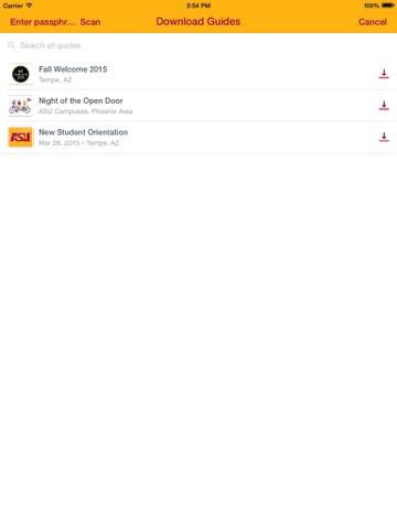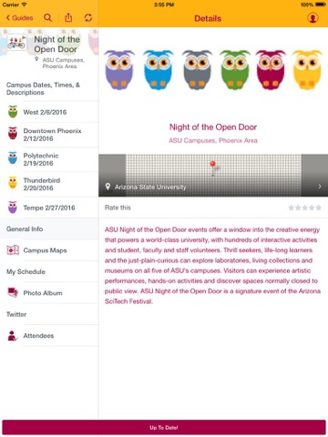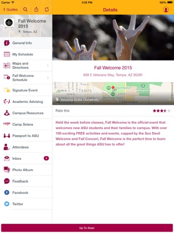 The ASU Guide application allows you to access pre-event and post-event information, directions, information about campus services, and to build your own schedule for the events you want to attend.