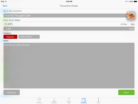 • Integration with the Athena Bitcoin business directory to auto complete transactions business information for the transaction. You may even include photos and logos!