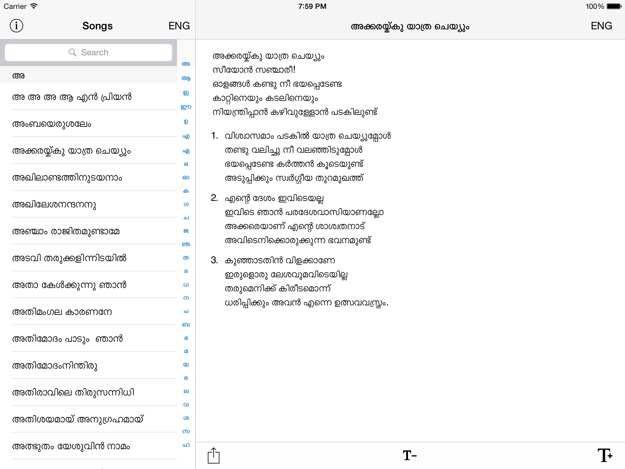 Malayalam Christian Songs App with more than 1300 songs in Malayalam Unicode and Manglish.