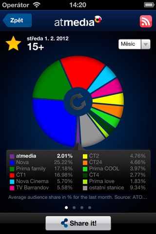 Společnost atmedia Vám přináší jednouchou aplikaci, s jejíž pomocí budete mít vždy po ruce informace o sledovanosti televizních stanic v České republice dle elektronického měření.