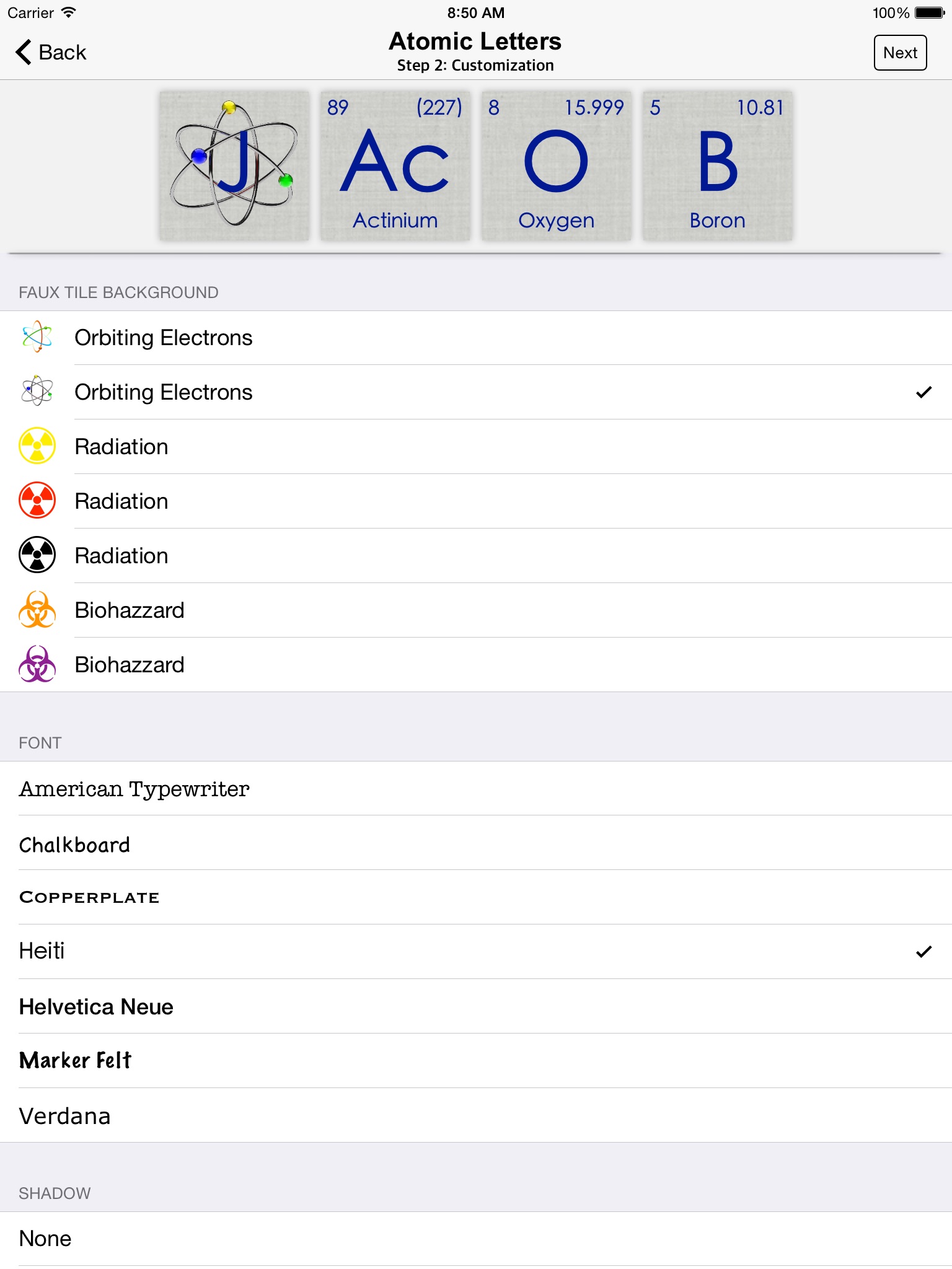 First select your spelling (The name "Corey" can start out with Carbon and Oxygen, or the the simpler Cobalt). Then customize it by choosing fonts, colors, background images, and shading. The Atomic Letters app will generate a PNG file suitable for everything from email signatures to t-shirt designs.