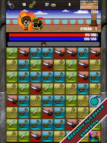 Simple and attractive gameplay. Similar to the diamond and gem match three puzzle games out there! Line up more than three of the same icons vertically or horizontally to trigger various combos. Destroy all the enemies before they destroy you. Your task is to dominate the pirate world by capturing all the pirates spots.
