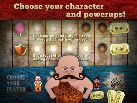 Start the game by selecting your character. You can use tickets earned in previous plays to buy permanent armor, cotton candy, or unlock new characters.