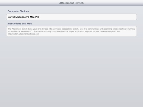 The Attainment Switch turns your iOS devices into a wireless accessibility switch! Use it to communicate with scanning enabled software running on any Mac or Windows PC or the GoTalk Now iPad App (http://bit.ly/gotalknow). Easy to customize, allowing access to any switch accessible software and replaces expensive switch interfaces and wired switches.