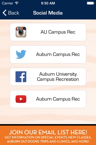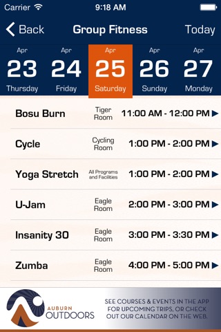 Are you an Auburn University student? This app puts detailed information about Auburn University Campus Recreation and the Recreation and Wellness Center at your fingertips. Register for group fitness classes, check out Intramural and Club Sport schedules, get updated pool hours, browse a list of upcoming events and programs, and receive notification of closures, cancellations, and more! Select your “favorites” with a click of a button, and receive reminders directly on your phone.