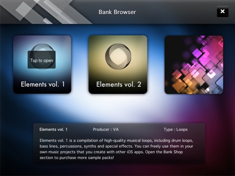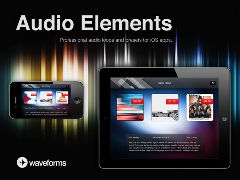 Audio Elements app gives you access to a vast collection of professional audio loops (like drum loops, baselines, synthesizer parts, special effects and many more) that are ready to be used in your own music projects, in wide range of iPhone and iPad apps that supports AudioPaste or General Pasteboard.