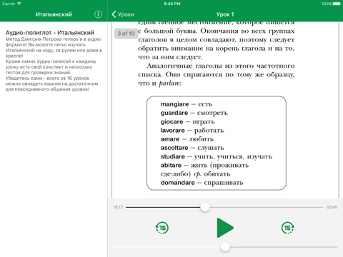 Широко известный метод Дмитрия Петрова теперь и в аудио формате! Вы можете легко изучать Итальянский на ходу, за рулем или дома в кресле! Кроме самих аудио-записей к каждому уроку есть свой конспект и несколько тестов для проверки знаний.