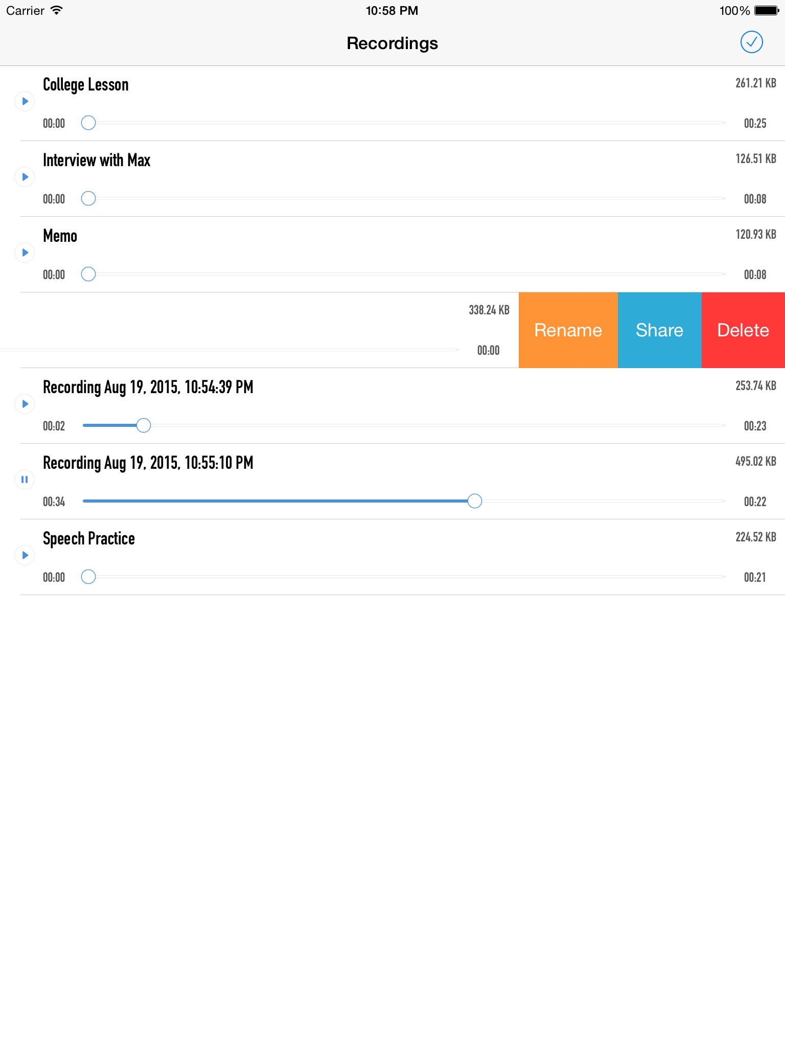 This app is easy to operate ... because all it does is record, save and play your input. You can also share it, etc. Swipe a recording left to delete, rename or share it.