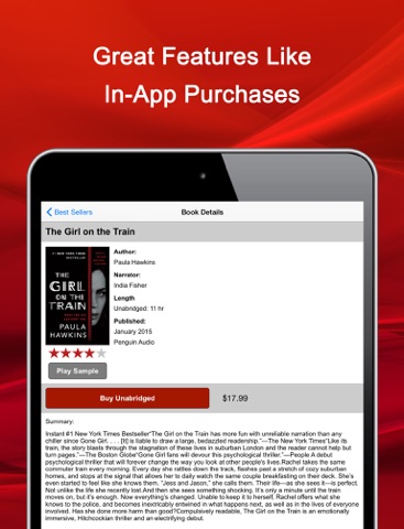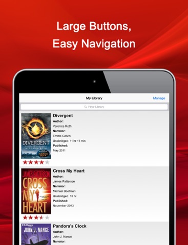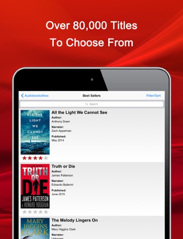 I love this app. Easy to get around and find what I am looking for. A must have for book lovers to keep up with the latest and greatest, best selling novels. Thumbs up Audio Books Now!!