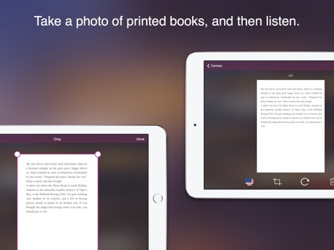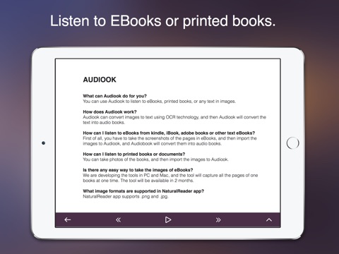 Audiook will convert any image to audio, so you can convert eBooks, printed books, or any text in images into audio books.