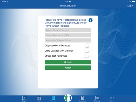 • Risk Calculator – Calculate the risk of de novo postoperative stress urinary incontinence after surgery for pelvic organ prolapse