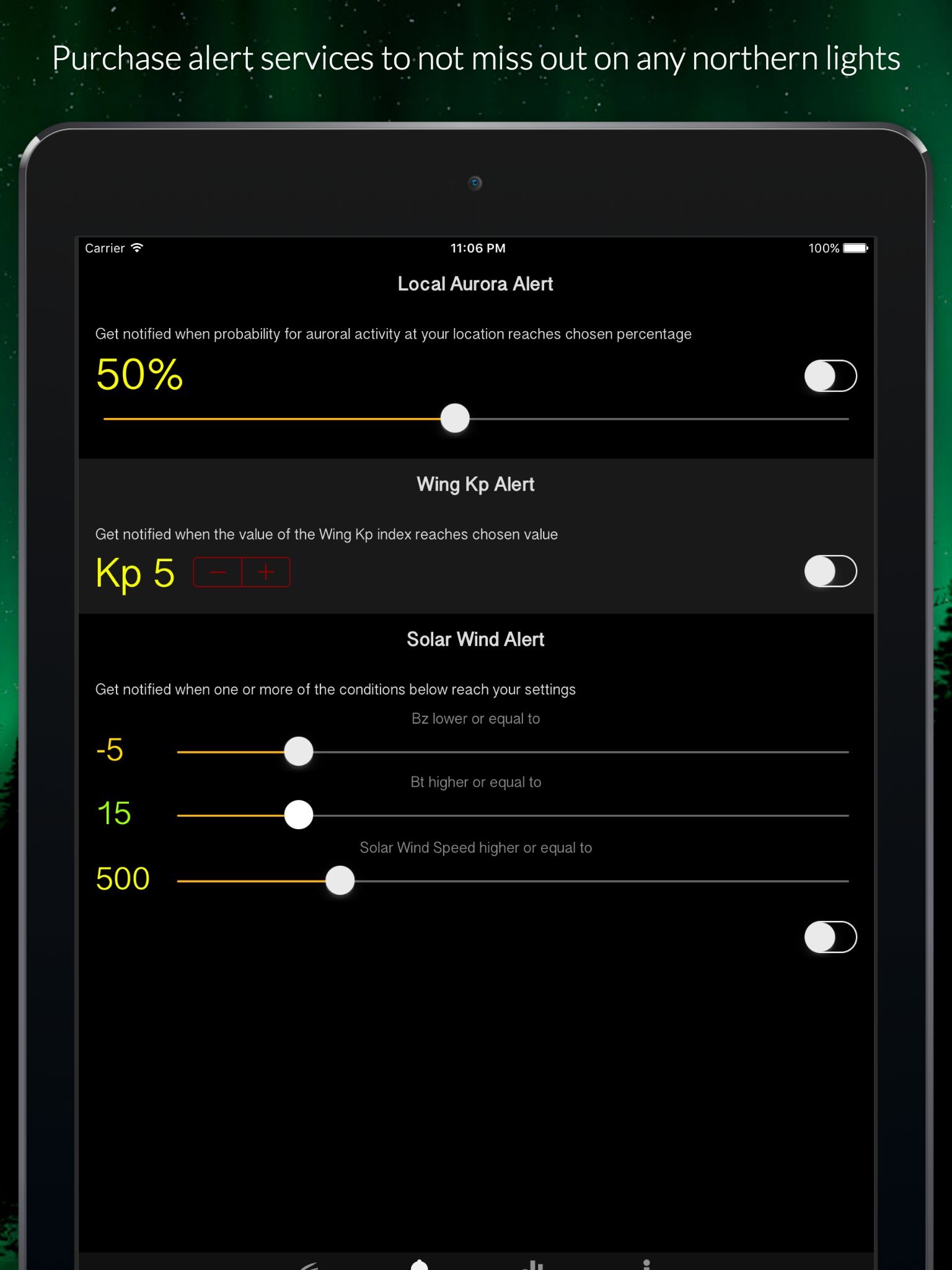 * Customizable Aurora Alerts: Never miss a moment of Northern Lights brilliance with our push notifications! If you choose to use our Alert Service, you have access to more customizable aurora alerts than any other Aurora app on the App Store. Examples: Get notified based on your local auroral activity, receive notifications 1-2 days prior to high activity, set up custom alerts for solar wind metrics like bt, bz, and speed and much more.