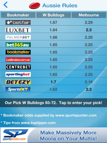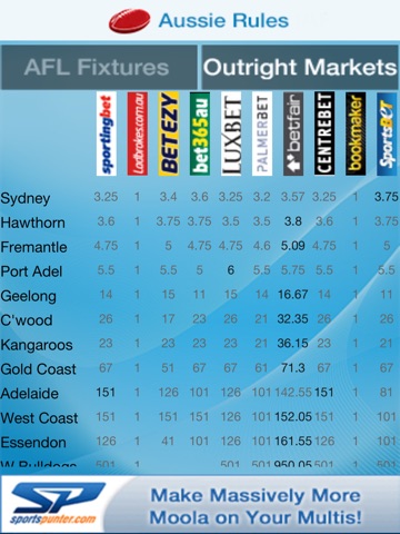 See the AFL betting odds from 10 of Australias top bookmakers. If you love AFL, betting on Aussie Rules, and the AFL game in general then you will surely love this app.