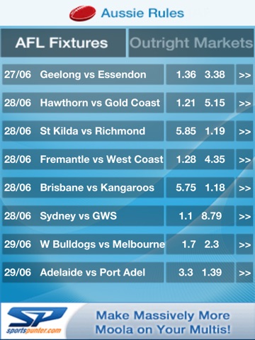 This is a simple but high quality app which has great betting information for the AFL. It is however just a beginning version. We want to hear what you want before we make further developments. So let us know what to include next to make your AFL odds app even better!