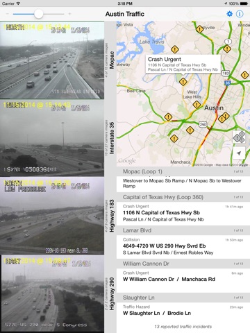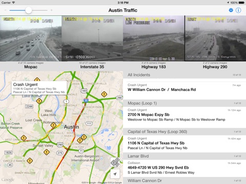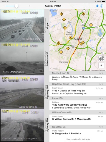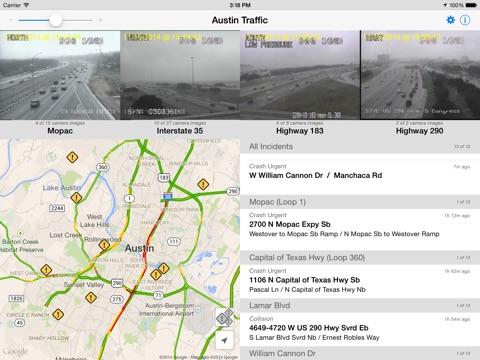 • View animated traffic camera images of four main roads in Austin. Tap on an image to pause the animation. The images come directly from TxDOT and may not always be functioning properly.