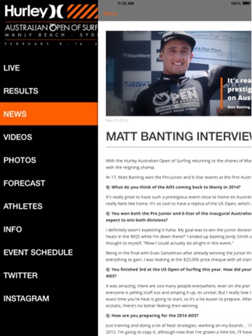 Watch the LIVE WEBCAST of the Australian Open of Surfing direct to your phone. Keep up with all the results, live scores, videos, news and photos and much more