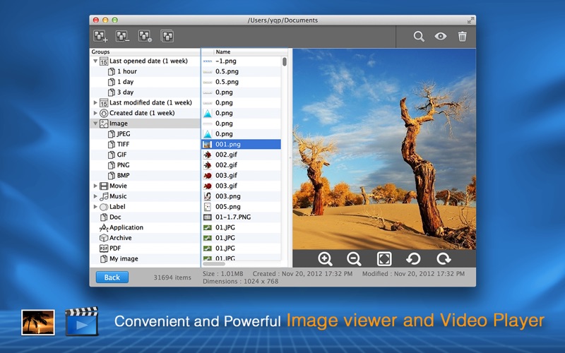 1 Preset dozens of commonly used file groups, including Last opened date, Last modified date, Created date, PDF, Archive, Label, Doc documents, Image (JPEG, TIFF, GIF, PNG, BMP…), Movie (AVI, RMVB, QuickTime, MP4, FLV, MKV...), Music (MP3, WMA, WAV, FLAC, M4A...) and so on.