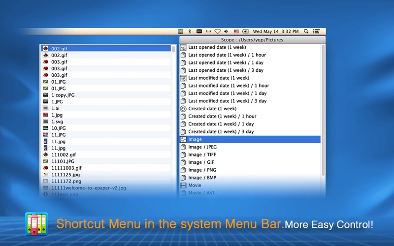 * Kind: Contains 7 basic categories that is “Application”, “Image”, “Movie”, “Music”, “PDF”, “Archive” and “Custom”. In the “Custom” category, files can be grouped by the file extension that covers all file types. You also can refine each category according to Pixel width, Pixel height, Channels, Sample rate and Bits per sample.