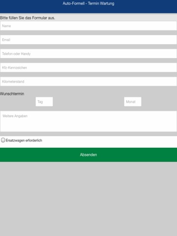 Ist eine Reparatur fällig, wird hiermit schnell der Termin gemacht. Sie geben einfach den Wunschtermin ein und ob Sie einen Ersatzwagen benötigen. Mit ein paar kleinen zusätzlichen Angaben, wie z.B. Unfall, Scheibe defekt oder Klimaservice können wir uns noch besser auf die Terminabsprache vorbereiten und Sie sparen wertvolle Zeit.