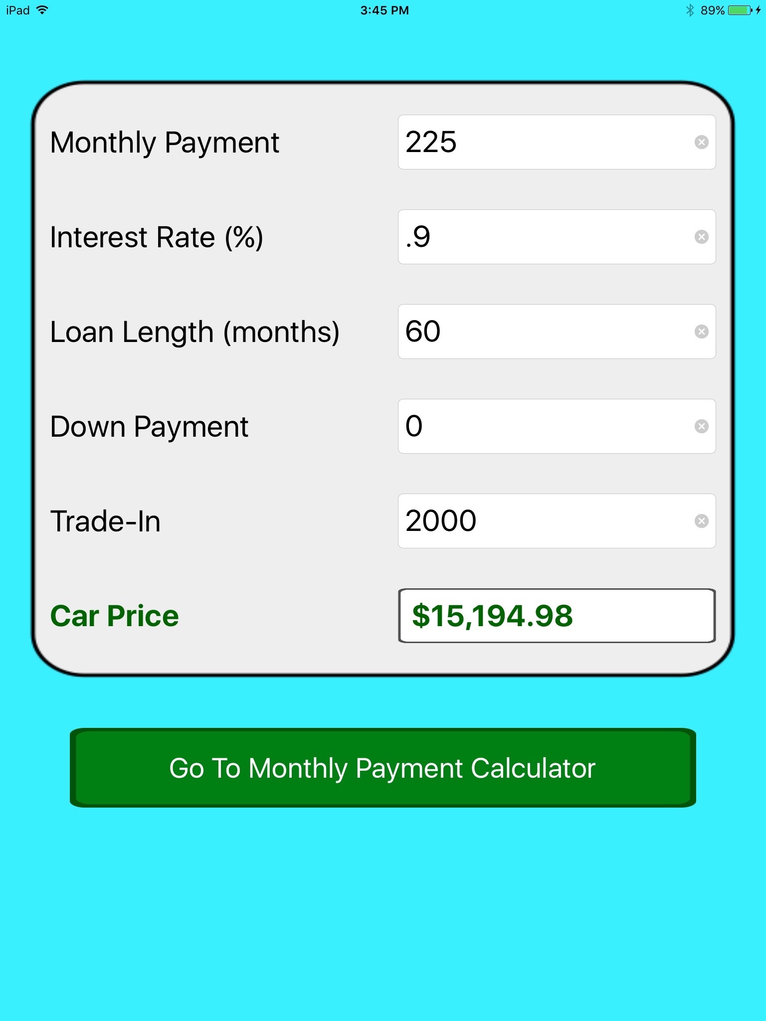 Provides two functions for car shopping. One is to calculate what a monthly payment will be, the second is how much car you can afford based on the monthly payment you choose and loan factors.
