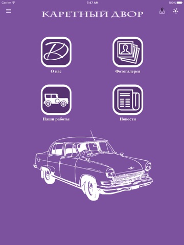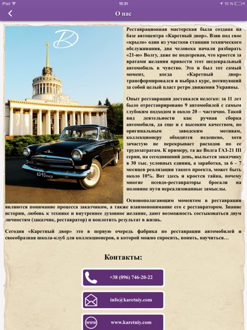 Мобильное приложение для любителей Ретро автомобилей, создано фабрикой по реставрации автомобилей «Каретный двор», которая является своеобразной школой-клубом для коллекционеров, в которой можно спросить, понять, научиться, получить консультации по формированию частных и созданию отдельных коллекций, заказать разработку дизайна интерьера-экстерьера гаража.