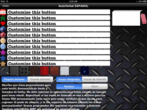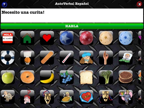 Elegant, customizable interface. Use 100s of prerecorded buttons to speak your desired words/phrases. You can also type messages and have them spoken! Select Male or Female high quality TEXT-TO-SPEECH Spanish voices, using the Internet, or built-in voices which are faster but not as high quality.