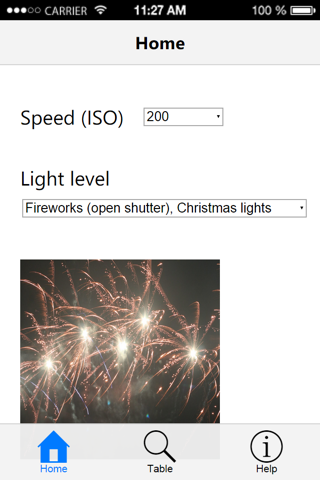 Modern cameras have great built-in light meters, but sometimes taking photographs using available light (i.e. without flash or other photographic lighting) can be a challenge, especially with long exposures in low light levels or very high intensity lighting. Fortunately in extreme conditions you can usually use an exposure guide like this one. Simply enter your film speed setting, choose the lighting conditions from the list and then see a table of shutter speed and aperture combinations. This table allows you to use a camera with manual control in conditions outside the range of the built-in light meter. The app will also compute the Exposure Value and light level in lux. Its a simple tool to help you take good photographs in difficult conditions.