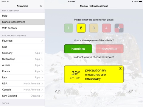 This app helps you with your risk assesment in avalanche risk areas. Regardless if your are backcountry skiing or freeriding, this app will support you while planning your trip. On site, you can verifiy the conditions with the automatic slope angle measurement.