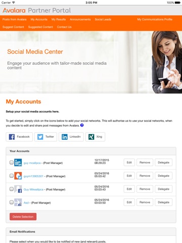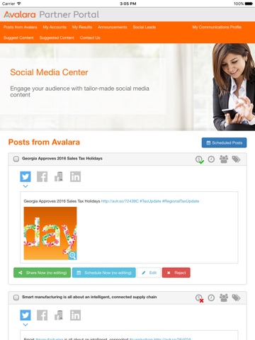 Avalara Social Media Center is a global enterprise-class social syndication solution that enables Avalara to socially enable their advocates - employees, sales partners, influencers and other brand ambassadors. Content is shared via the app to the advocates who can, in turn, share this content via their own social channels.